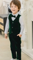 темно зелений оксамитовий костюм на хлопчика 4-7 років. у комплектації безрукавка, штани, сорочка, метелик. вартість прокату вказана за 1 добу на вік 4-6 років